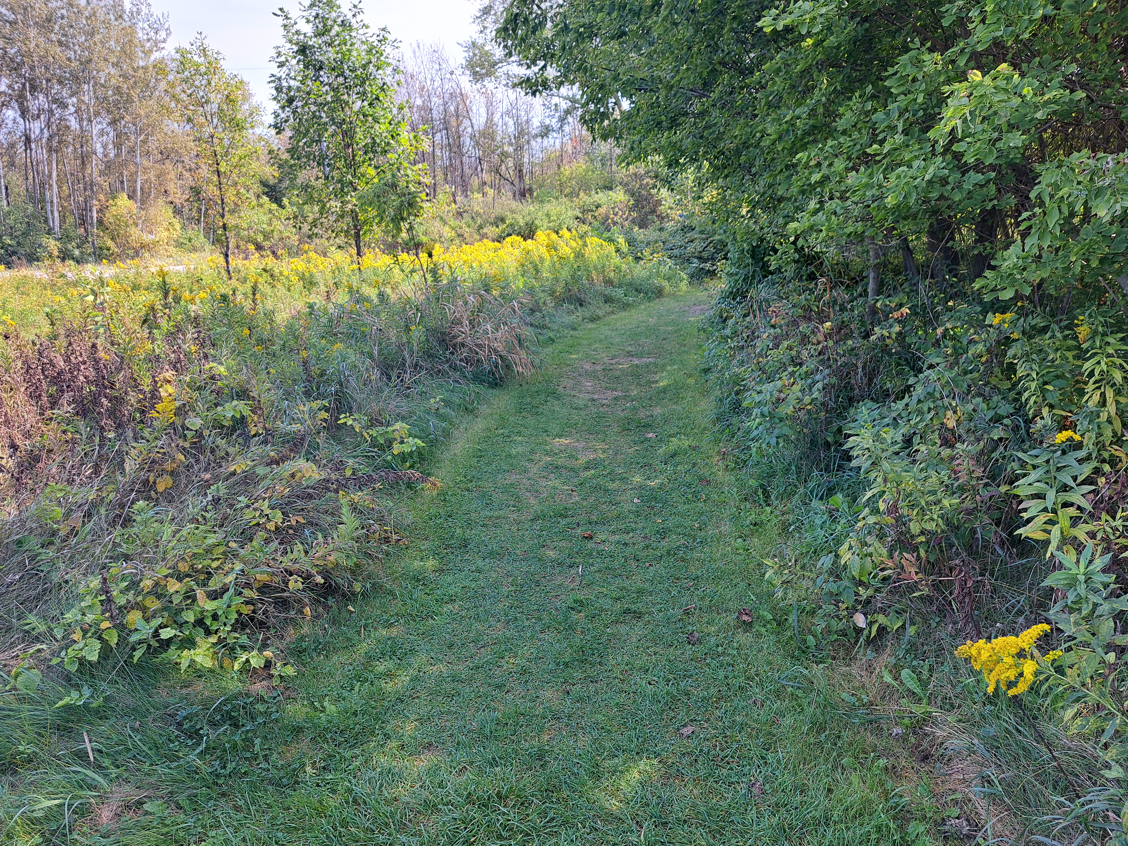 At 0.25 miles, the Green Trail angles right to leave the road. For the next 0.7 miles the grass/dirt trail climbs gradually as it heads almost due east. The park's south boundary lies only a few feet to the right, and this park's largest tallgrass prairie unfolds to the left. The grass dominates the prairie here, and the late summer wildflowers are less impressive than those at nearby Richard Bong State Recreation Area, which is my favorite prairie in Wisconsin. Ignore the Black and Orange Trails when they exit left.